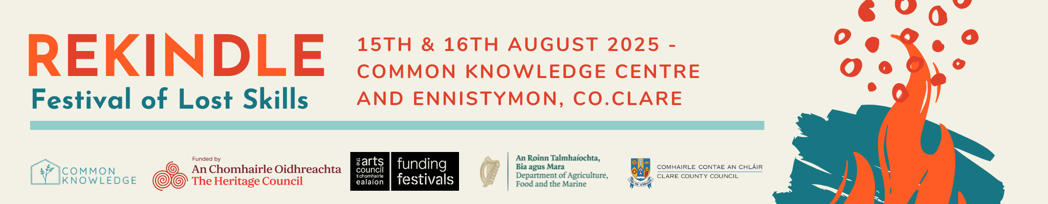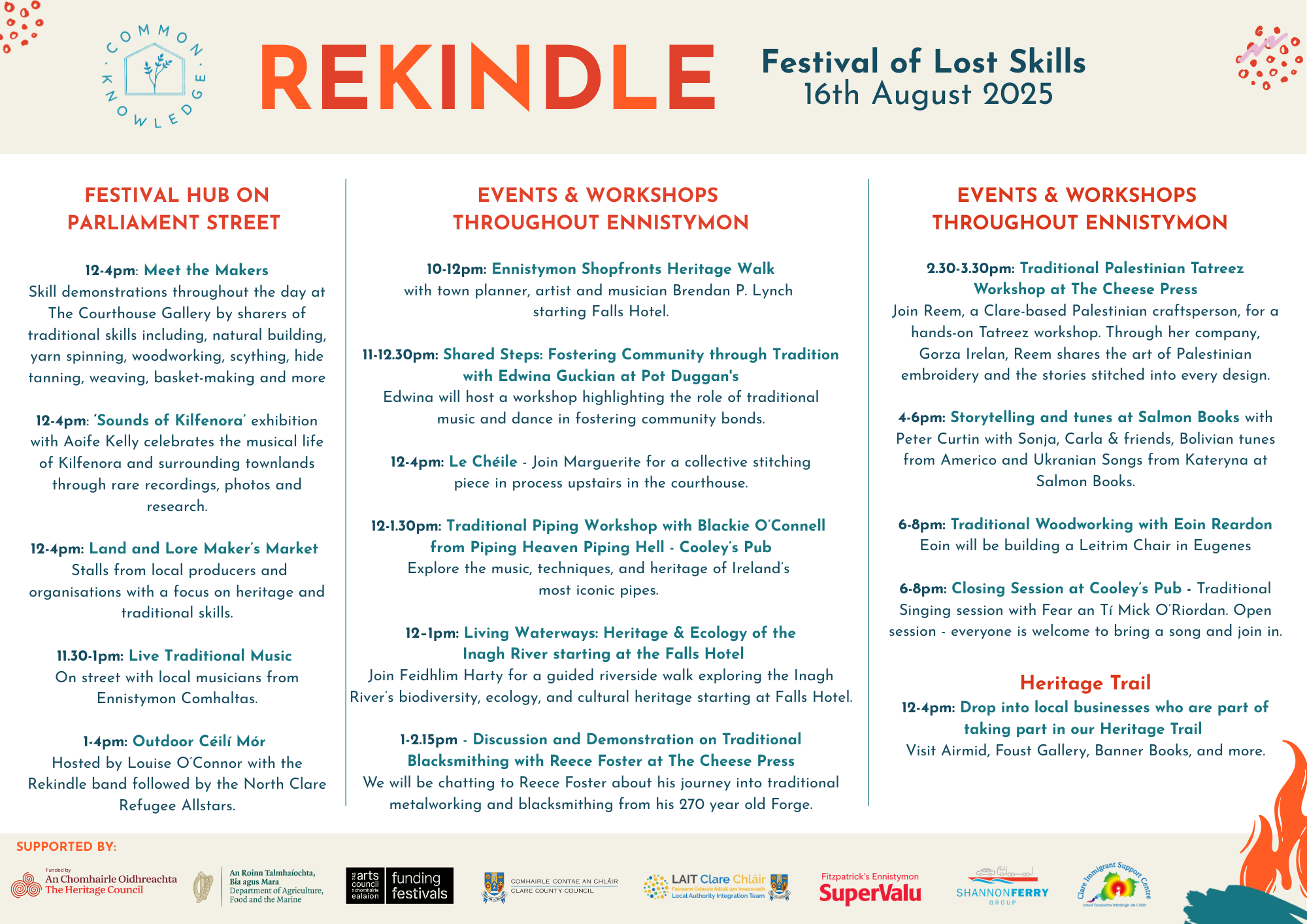 Rekindle Festival of Lost Skills is funded by The Heritage Council, the Arts Council and Clare County Council, Hotel Doolin, Doolin Ferry, Shannon Ferries and The Armada